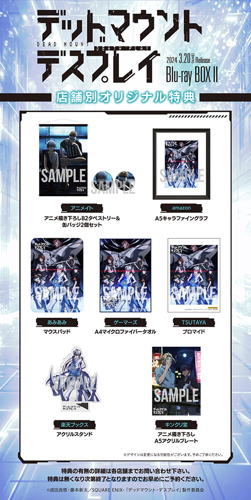 TVアニメ「デッドマウント・デスプレイ」Blu-ray BOX Ⅱを対象店舗にてご購入いただきましたお客様(既にご予約いただいたお客様も対象)に応募用紙をお渡し致します。
