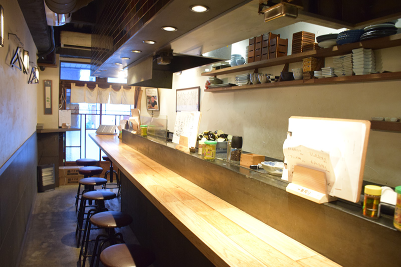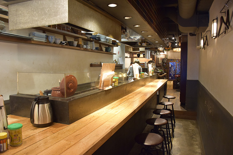 新宿三丁目駅C7出口から徒歩約3分。三番街通り沿いにあるそのお店には、「鰻とジビエ」という暖簾が掲げられていた。くぐった先で見えてきたのは縦長のカウンターと、焼き魚をおいしそうに頬張るお客さんたちの姿。和モダンな雰囲気が漂う店内では、落ち着いて食事ができそうだ。